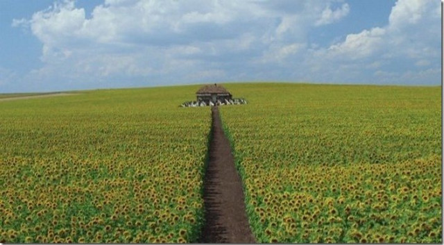 Кіношний Трохимбрід, як і все в тому фільмі геть не подібний на справжній. Одинока хатинка посередині соняшникового поля. А-ля Куштуріца.