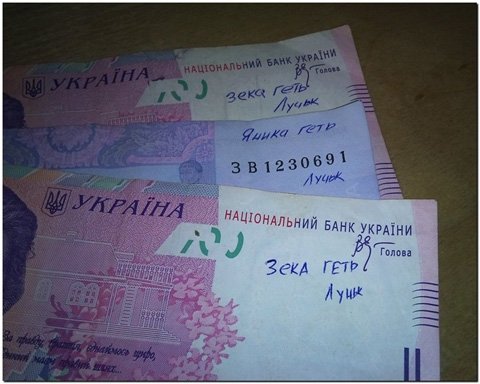 Всього напис "Зека геть" фігурує на гривнях, які в сумі складають 7203 грн.