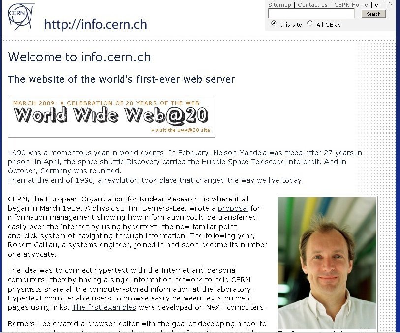 Його творець, Тім Бернерс-Лі, опублікував на ньому опис нової технології World Wide Web, заснованої на протоколі передачі даних HTTP, системі адресації URI і мові гіпертекстової розмітки HTML. Також на сайті були описані принципи установки РОБОТИ серверів браузерів. Сайт став і першим в світі інтернет-каталогом, оскільки пізніше Тім Бернерс-Лі розмістив на ньому список посилань на інші сайти.