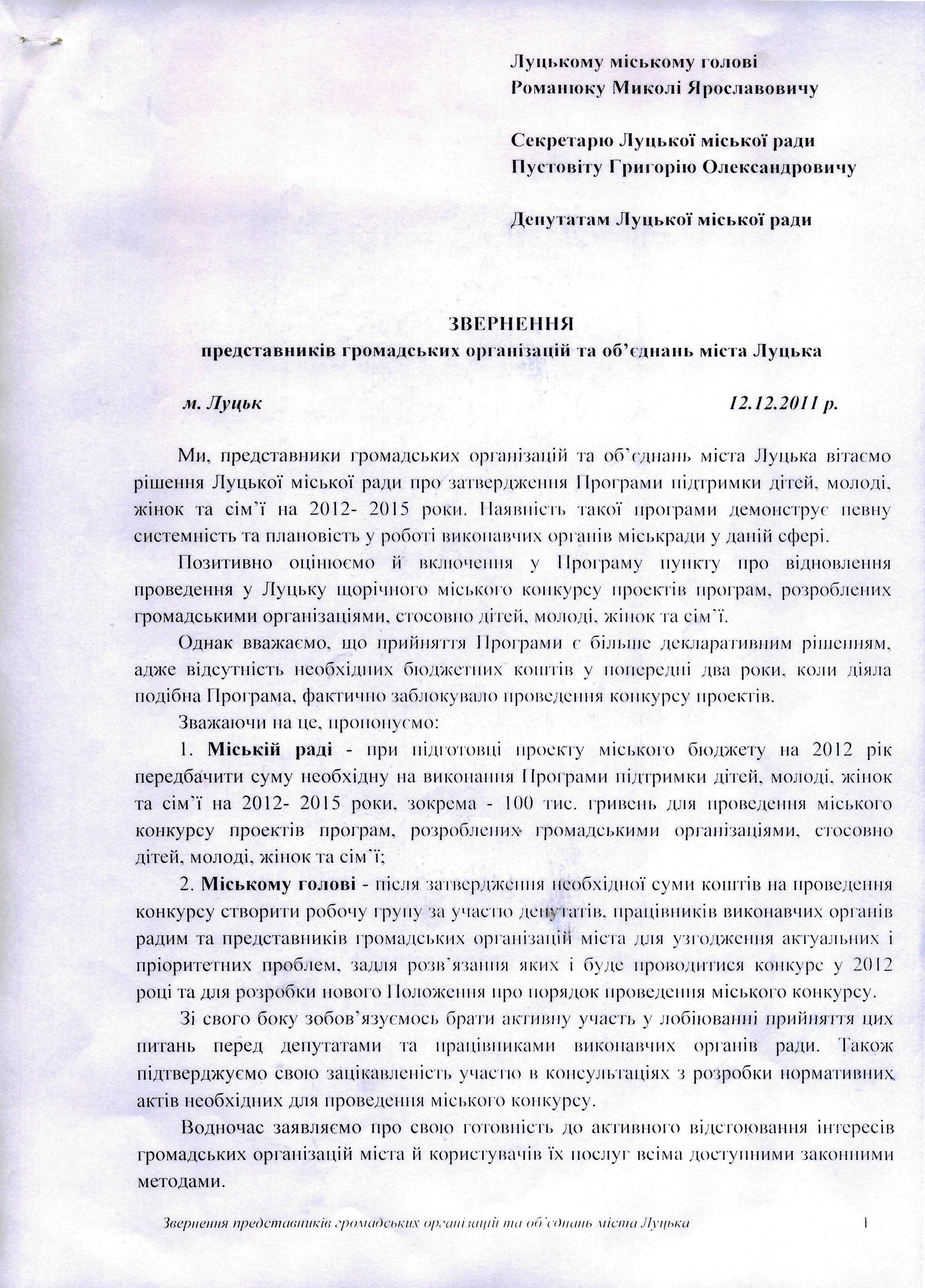Ми, представники громадських організацій та об’єднань міста Луцька вітаємо рішення Луцької міської ради про затвердження Програми підтримки дітей, молоді, жінок та сім’ї на 2012- 2015 роки. Наявність такої програми демонструє певну системність та плановість у роботі виконавчих органів міськради у даній сфері.