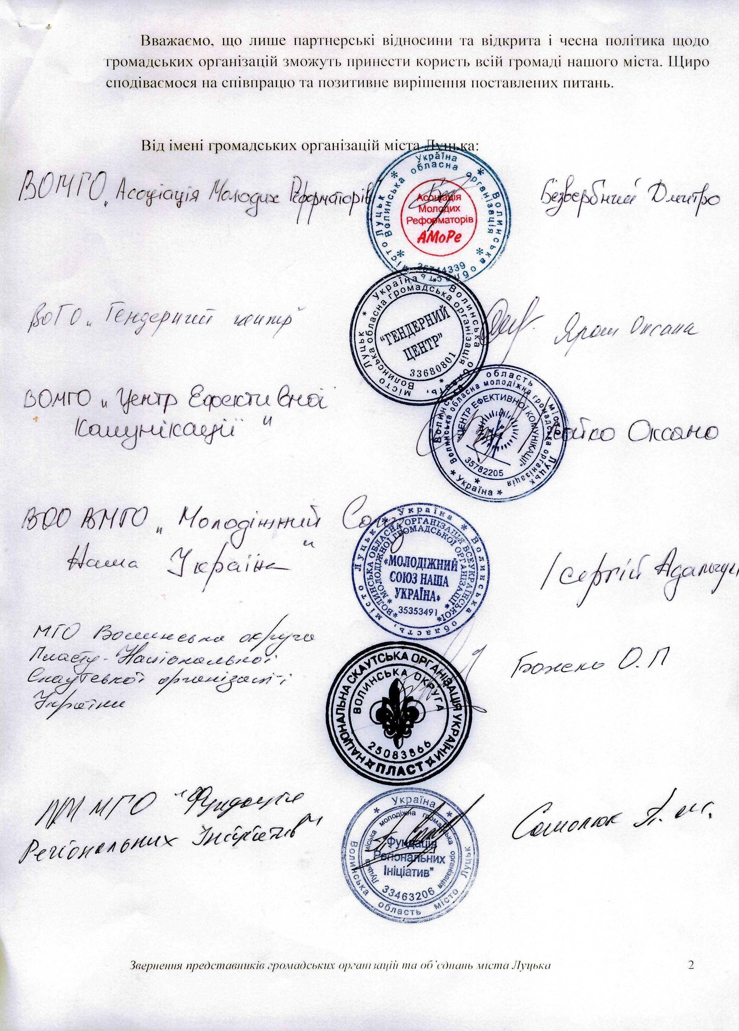 Вважаємо, що лише партнерські відносини та відкрита і чесна політика щодо громадських організацій зможуть принести користь всій громаді нашого міста. Щиро сподіваємося на співпрацю та позитивне вирішення поставлених питань.