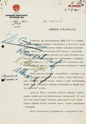 У таборах для військовополонених НКВС СРСР й у в'язницях західних областей України й Білорусії на сьогоднішній день утримується велика кількість колишніх офіцерів польської армії, що були працівниками польської поліції й розвідувальних органів, членів польських націоналістичних контрреволюційних партій, учасників розкритих контрреволюційних повстанських організацій, перебіжчиків й ін. Всі вони є заклятими ворогами радянської влади, сповненими ненависті до радянського строю.