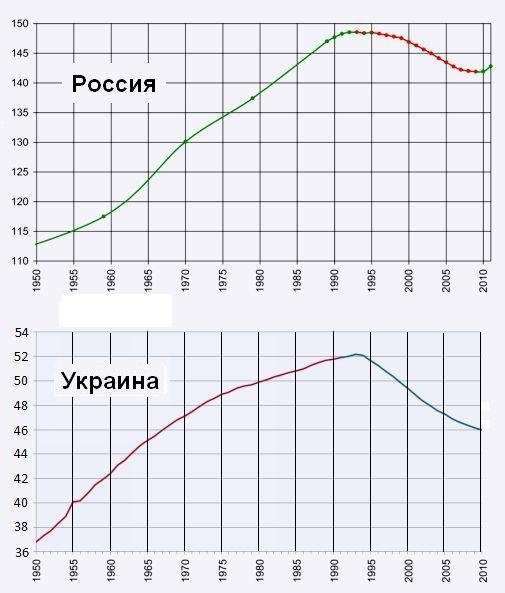 Давайте сопоставим потери населения за последние 10 лет на Украине и в остальной России. А то у нас хватает любителей противопоставлять «цивилизованную европейскую демократию» на Украине российскому «путинскому режиму». Итак, население Украины http://www.ukrstat.gov.ua/operativ/operativ2007/ds/nas_rik/nas_r/nas_rik_r.html: 2001 г. – 48,9 млн. чел., 2011 – 45,8 млн. чел., т.е. потери 6,3%. Население России: 2001 г. – 145,5 млн. чел., 2011 – 142,9 млн. чел. Конечно, нужно учесть миграцию в Россию за эти 10 лет. Она составила 2,0 млн. чел. http://www.gks.ru/free_doc/new_site/population/demo/migr2.xls Таким образом, без учета миграции потери составляют 4,6 млн. чел., т.е. 3,2%.