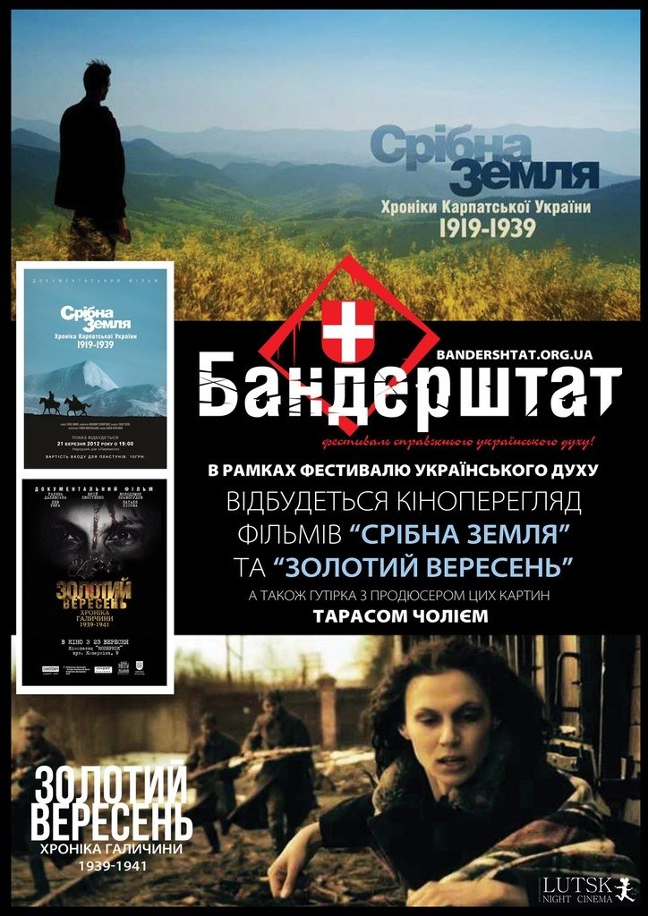 Спеціально для відвідувачів у рамках фестивалю українського духу Бандерштат відбудеться нічний кіноперегляд фільмів ” Срібна Земля” та “Золотий вересень”. Також глядачі матимуть змогу поспілкуватися із продюсером кінофільмів – Тарасом Чолієм.