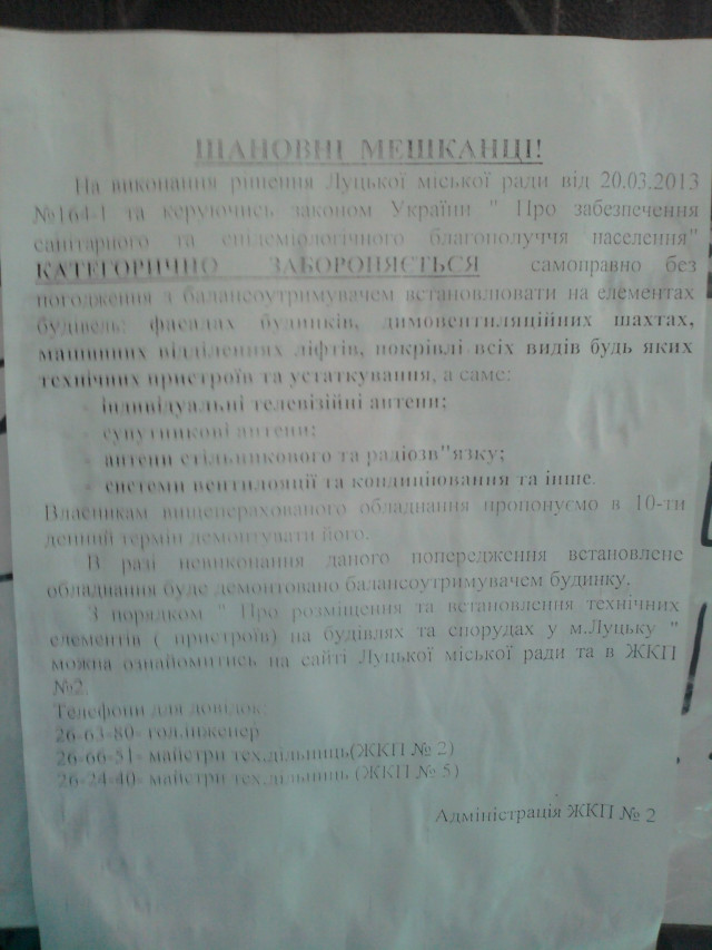 Действительно давно пора запретить устанавливать на фасадах тарелки и кондиционеры .Тарелки цепляют на парапеты домов соотвественно разрушая их.Девушка написавшая етот бред о атаке ЖКП видимо большой специалист в сфере жилищного хозяйства.Сначала чем показы вать свою дурь нужно розобратся.P.S.Я неявляюсь работником жека и их адвокатом.