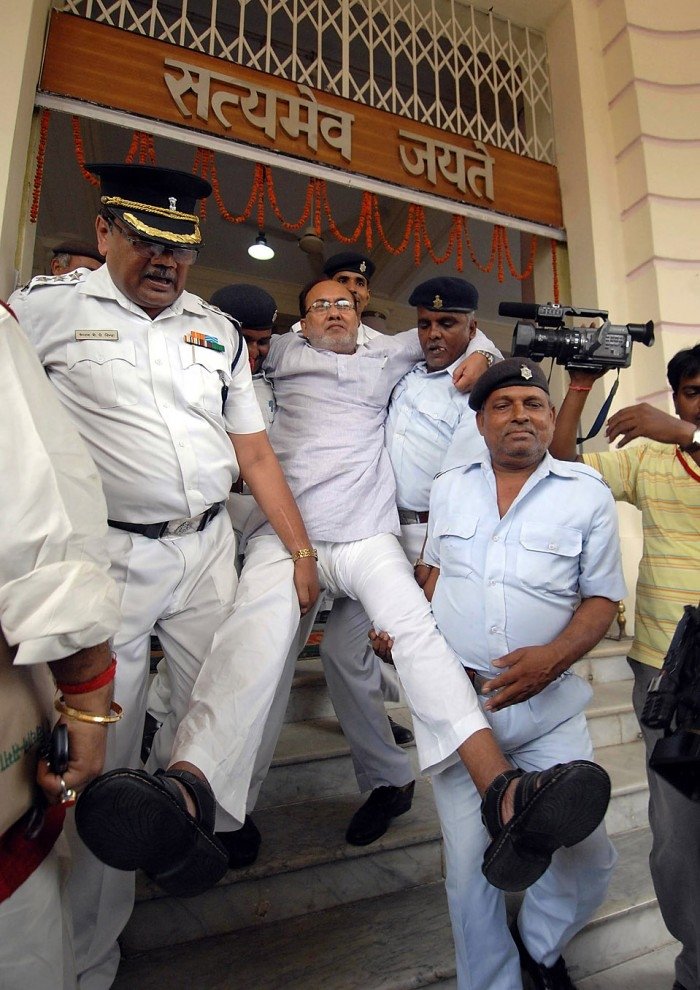 10. Работники индийской службы безопасности выносят члена оппозиции из здания, где проводилось законодательное собрание, в Патне. (Sonu Kishan/AFP/Getty Images)