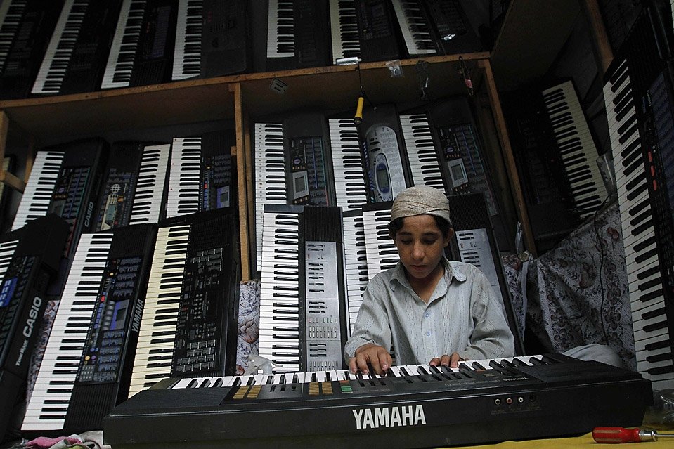 11. Пакистанский торговец чинит б/у синтезатор, импортированный (как и все остальные) из Европы и теперь продаваемый в Карачи. (Shakil Adil/Associated Press)