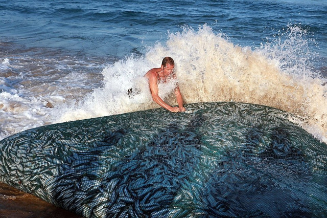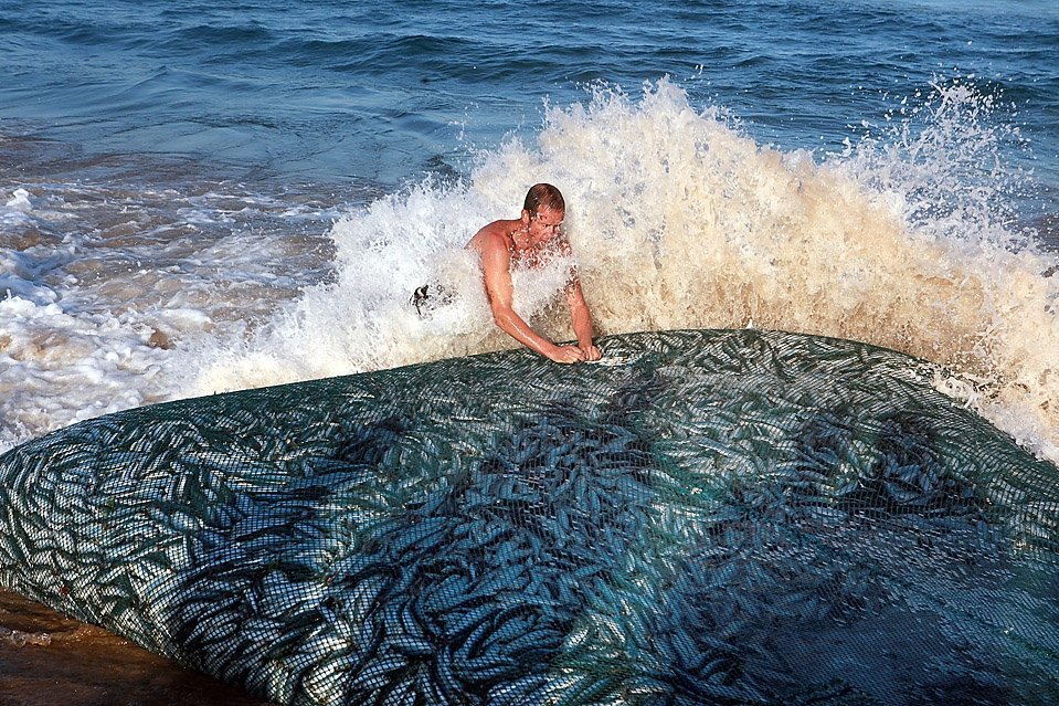 12. Рыбак пытается сложить свой улов сардин. Сотни людей бросились к берегу, на который прибило тысячи сардин, в Дурбане. (Rajesh Jantilal/AFP/Getty Images)