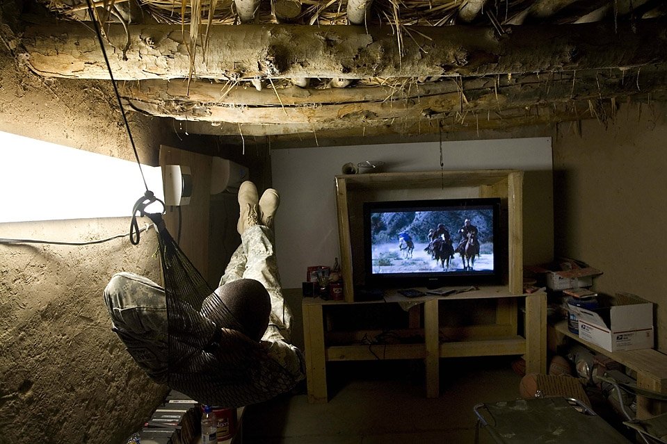 3. Американский солдат смотрит афганский фильм по телевизору на базе в долине Аргхандаб, Кандагар. (Rodrigo Abd/Associated Press)