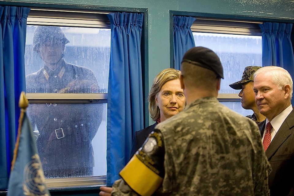 4. Северокорейский солдат смотрит в окно вагончика с госсекретарем США Хиллари Клинтон и министром обороны Робертом М.Гейтсом, во время их визита в деревню Панмуньом в демилитаризованной зоне, разделяющей Северную и Южную Корею со времен Корейской войны. (Associated Press/Defense Department)