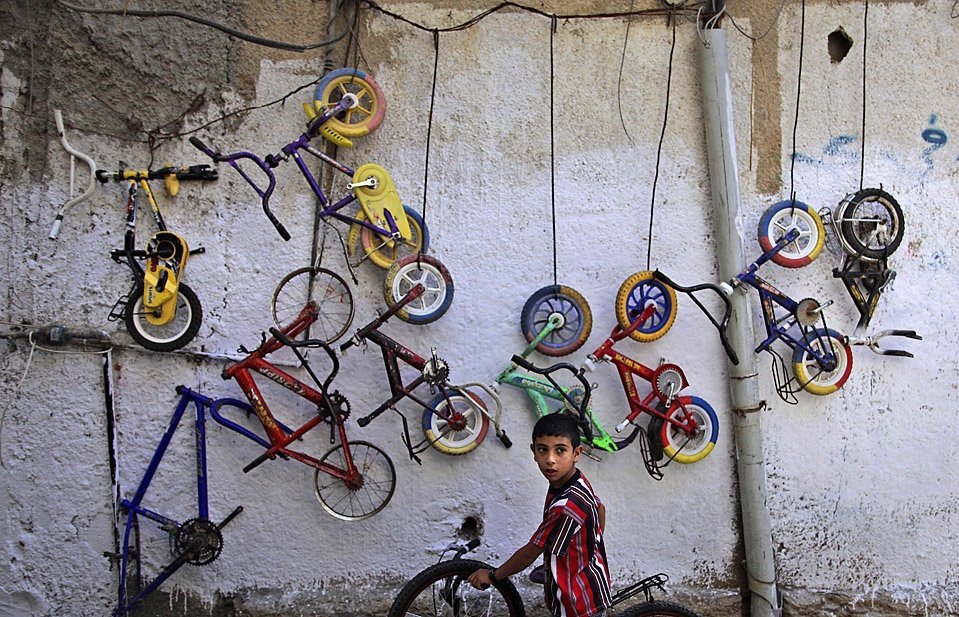5. Палестинский мальчик купил шину на велосипедное колесо в магазине. а его сестра шкатулки для украшений, в переулке лагеря для беженцев Аль-Амари, в городе Рамалла. (Muhammed Muheisen/Associated Press)