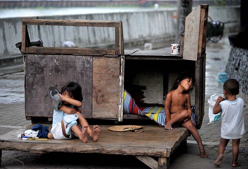 7. Дети, живущие в деревянной телеге, отдыхают на улице Манилы. Филиппинское правительство говорит, что скоро будет давать деньги бедным семьям, чтобы побороть резкий рост количества голодающих филиппинцев. (Noel Celis/AFP/Getty Images)