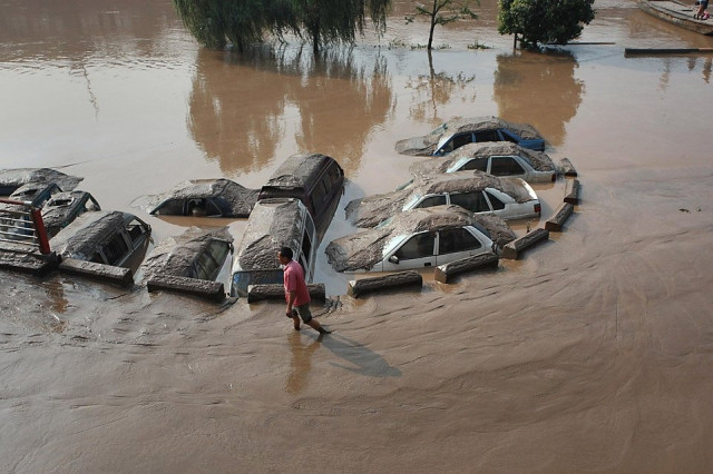2. Китаец проходит мимо автомобилей, застрявших в паводковых водах, в Чунцине. В результате наводнения погибли 170 человек и 347 до сих пор считаются пропавшими. (ImagineChina/ZUMApress.com)