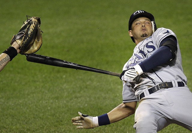 13. Джейсон Бартлетт из команды «Tampa Bay Rays» падает на спину, чтобы избежать столкновения с мячом, брошенным Альфредо Симоном из команды «Baltimore Orioles» на матче в Балтиморе. «Oriole» выиграли со счетом 11-10. (Rob Carr/Associated Press)