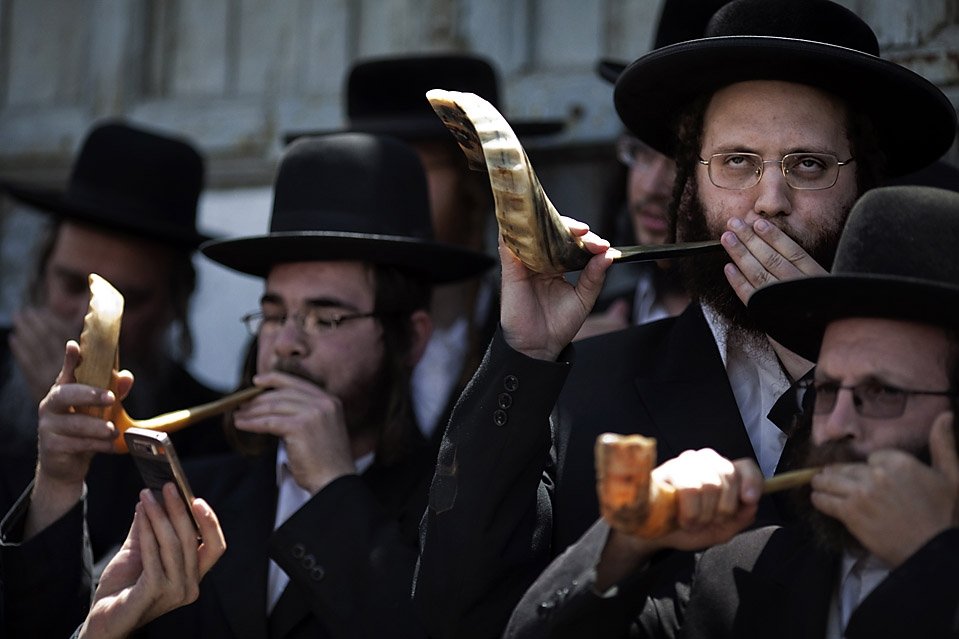 14. Ультраортодоксальные евреи дуют в шофары во время акции протеста против компании, которая, по словам демонстрантов, планирует убрать древние гробницы, чтобы построить новое здание в Яффе. (Marco Longari/Agence France-Presse/Getty Images)