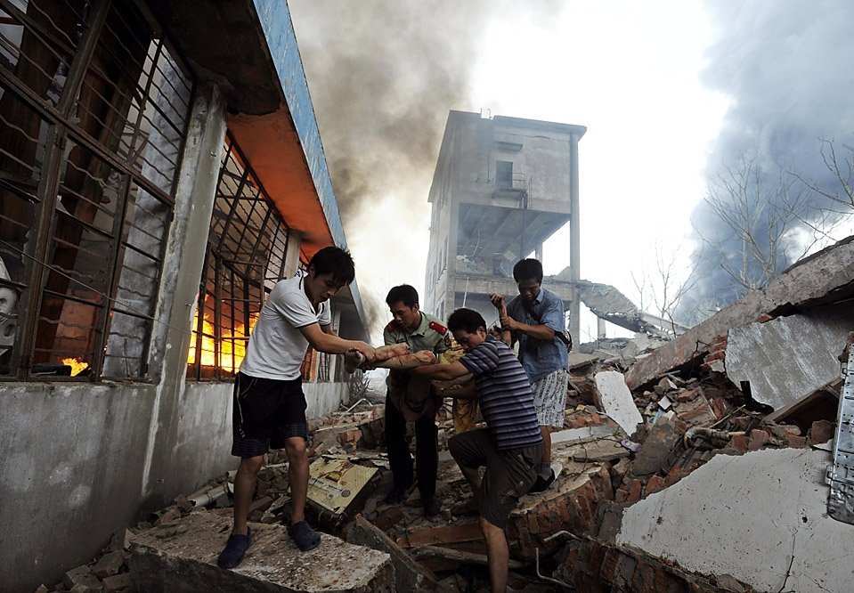 2. Жители Нанкина, провинция Цзянсу, несут человека, раненого в результате взрыва на заводе по производству пластика. В результате взрыва погибли 12 человек и сотни получили травмы разной степени тяжести. (China Daily/Reuters)