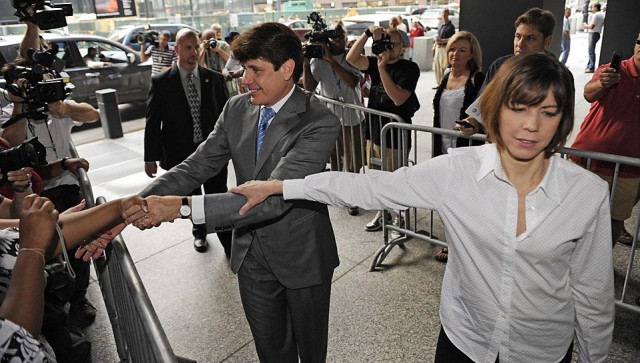 13. Пэтти Благойевич тянет своего супруга, губернатора Рода Благойевича, против которого выдвинуто обвинение, в первый день судебных разбирательств в Чикаго по вопросу о его коррупции. Губернатора обвиняют в попытке продать место в Сенате. (Tannen Maury/European Pressphoto Agency)