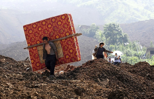3. Жители китайского городка в провинции Сычуань несут свои вещи из домов, пострадавших от оползня. В результате природной катастрофы уже пропал 21 человек. (Xinhua/ZUMA Press)