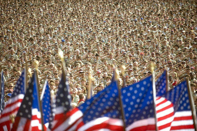 15. Более 45000 бойскаутов отдают честь во время исполнения национального гимна на мероприятии «2010 National Scout Jamboree» недалеко от Боулинг Грин, штат Вирджиния. Бойскауты празднуют 100-летие своей организации. (Cherie Cullen/Department of Defense via Associated Press)