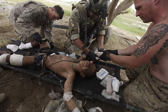 4. Сержант ВВС Бренден Паттерсон (в центре) и два американских солдата оказывают помощь афганскому мальчику, наступившему на самодельную мину. В результате мальчику оторвало руку, он также получил серьезные травмы ног.