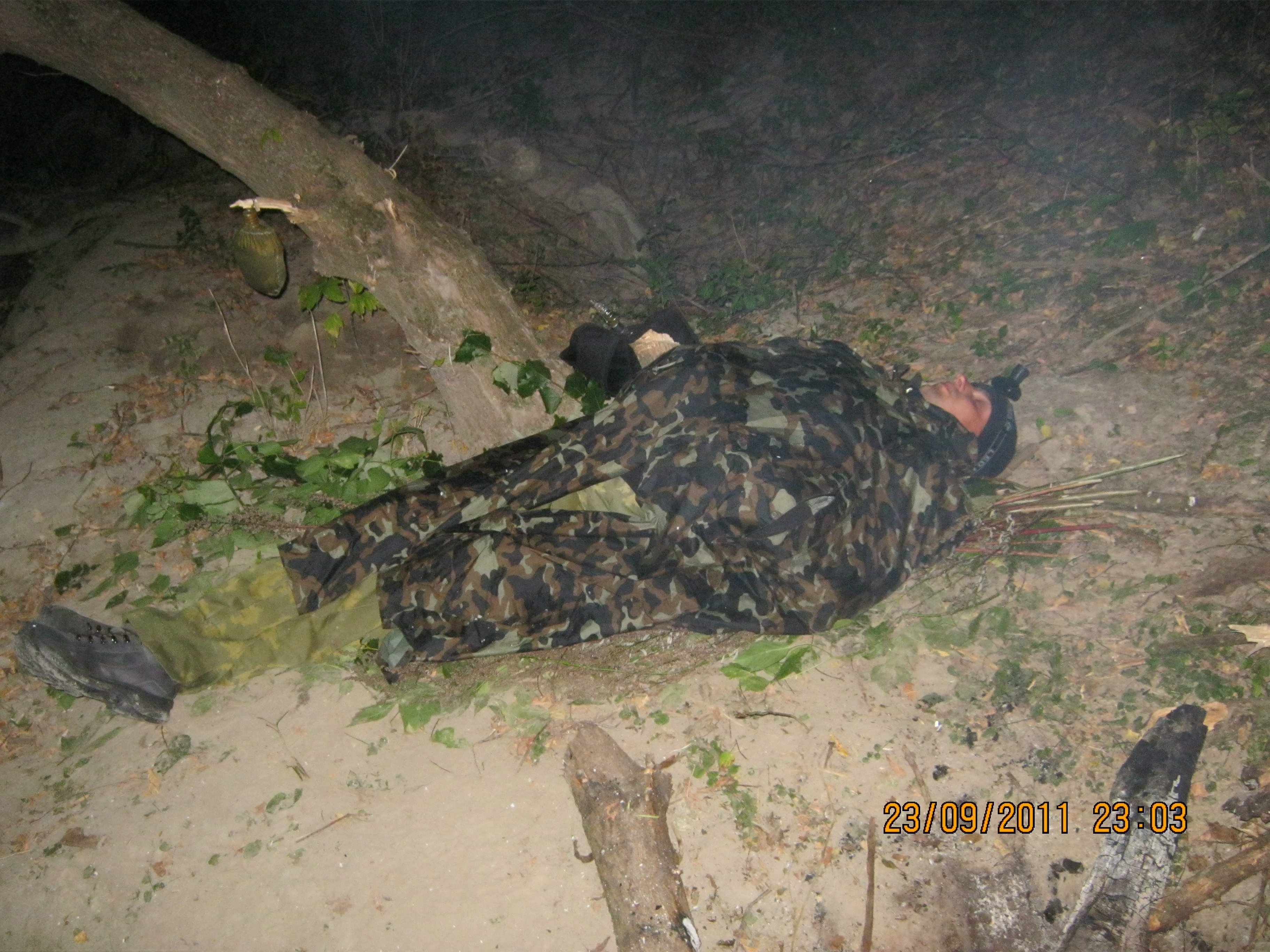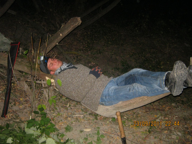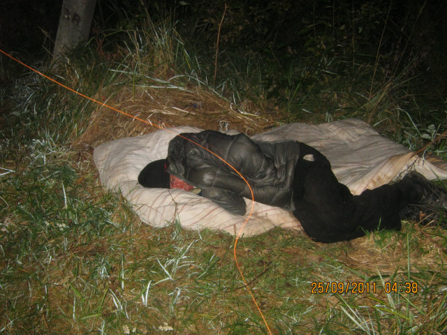 Від утоми не хочеться навіть їсти,тому розводимо невеличке багаття і лягаємо трохи перепочити. Не дивлячись на холод, спимо, як убиті, до години третьої ночі. Але під ранок стає нестерпно холодно, тому прокидаємось щоб якось зігрітись.Ходимо по кущах шукаємо хоч щось у вогонь, а зуб на зуб не попадає. У тих же кущах знаходимо місцевого "Єті". Він як справжня снігова людина спить під відкритим небом на старому погризеному матраці. Його хтось напевно викинув, матрац, а не Єті, за старість, от він і пригодився представникам місцевої фауни. Проте він напевно звик до такого життя, на цей раз Єті, а не матрац, спить як нібито на вулиці не +5, а всі +17. Намагаємось його розбудити, та нічого не виходить, сон у Сніжних людей дуже міцний.
