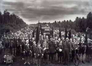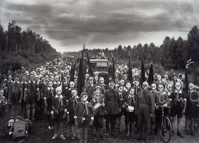 пишуть в неті, що це піонери, підняті за тривогою; фото зроблене в Ленінграді в 1937 році. Але мене оце більше штирить: http://hrenovina.net/wp-content/gas_weddyng.jpg