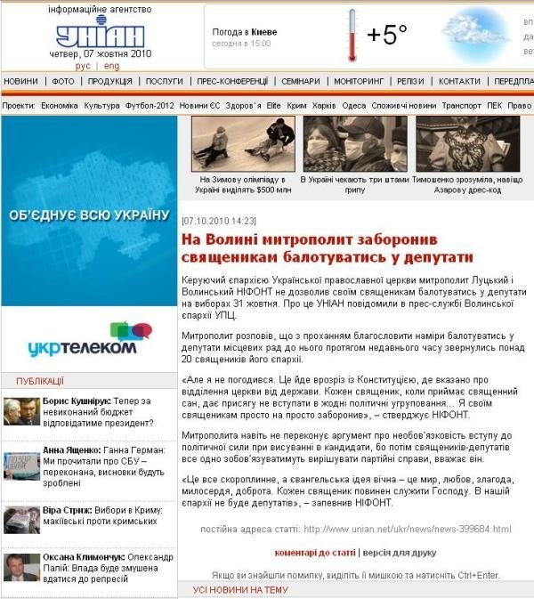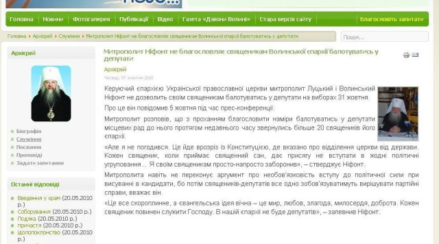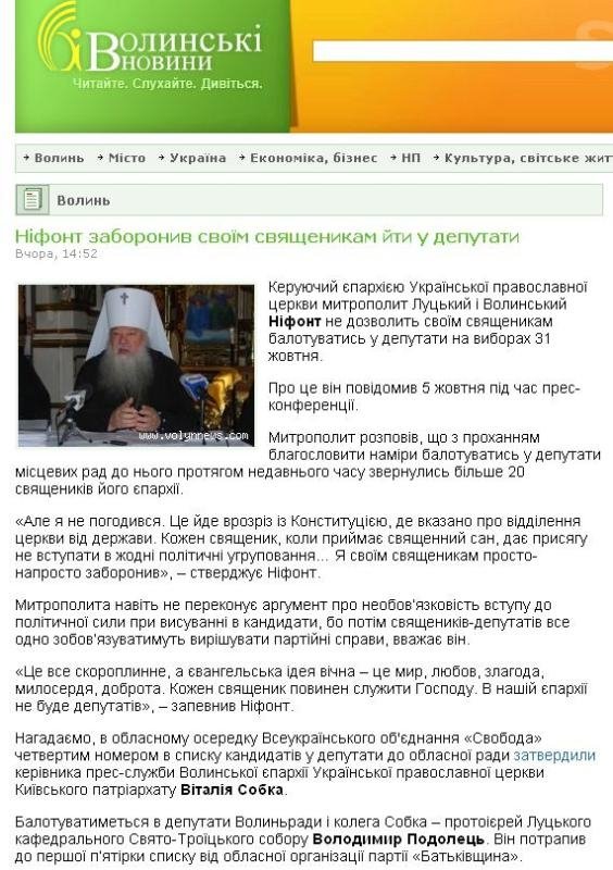 Цього разу у "ВН" викрали новину про те, що волинський митрополит УПЦ МП Ніфонт заборонив священикам своєї єпархії балотуватись у депутати. Новина була опублікована 6 жовтня о 14:52.