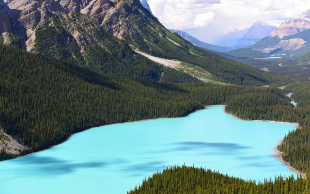Це озеро в Національному парку Банф зобов’язане своїм іскристим синім відтінком крижаній талій воді та мулу від льодовика Пейто, а також Льодяних полів Вапта. Синє як сапфір озеро найкраще розглядається від Вершини Боу в Альберті, що поруч із Лейк-Луїз.