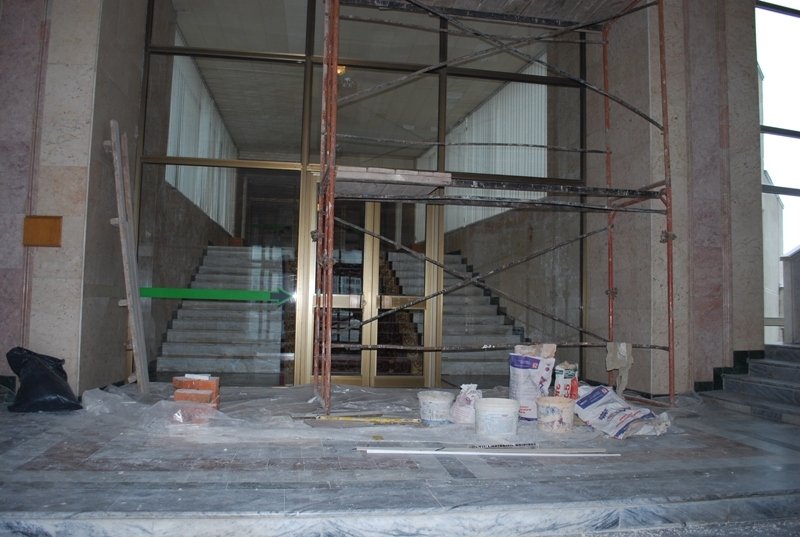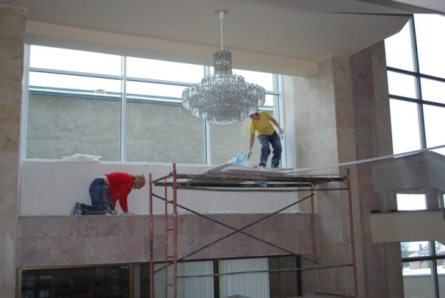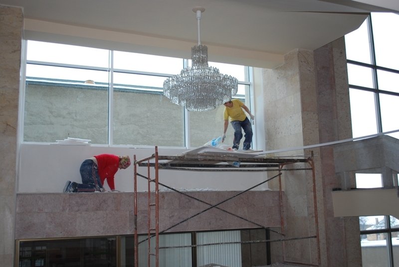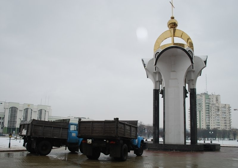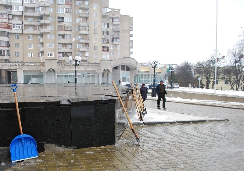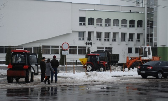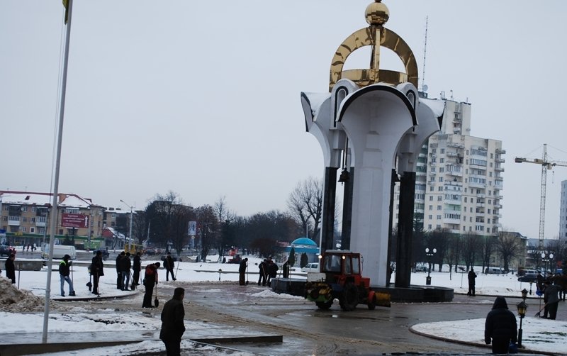 Від учорашнього дня на Київській площі активно розчищають сніг. Сьогодні там працюють декілька машин та близько 30 безробітних з служби зайнятості. Вони там працюють на умовах громадських робіт. Сніг розчищують і вивозять геть і біля Податкової адміністрації. А у середині облдержадміністарції затяли невеличкий косметичний ремонт.