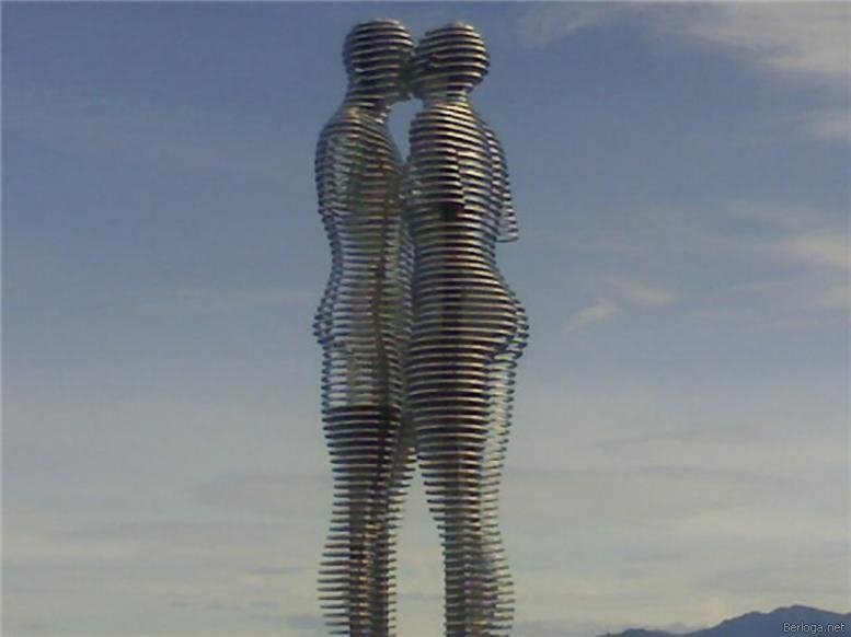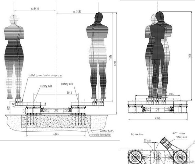 Примечательно то, что скульптура… подвижная. Семиметровые схематичные фигуры мужчины и женщины вращаясь движутся навстречу друг к другу и сливаются воедино.