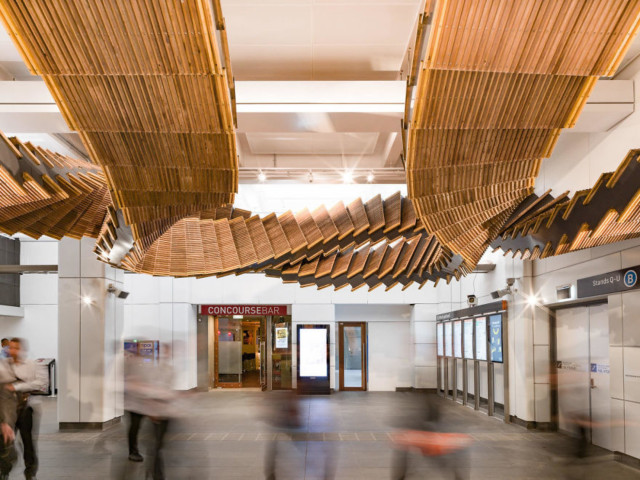 На станції Wynyard Сіднейського метрополітену відкрилася інсталяція Interloop, яка виглядає як нескінченні петлі, підвішені над головами пасажирів, пише TJ.