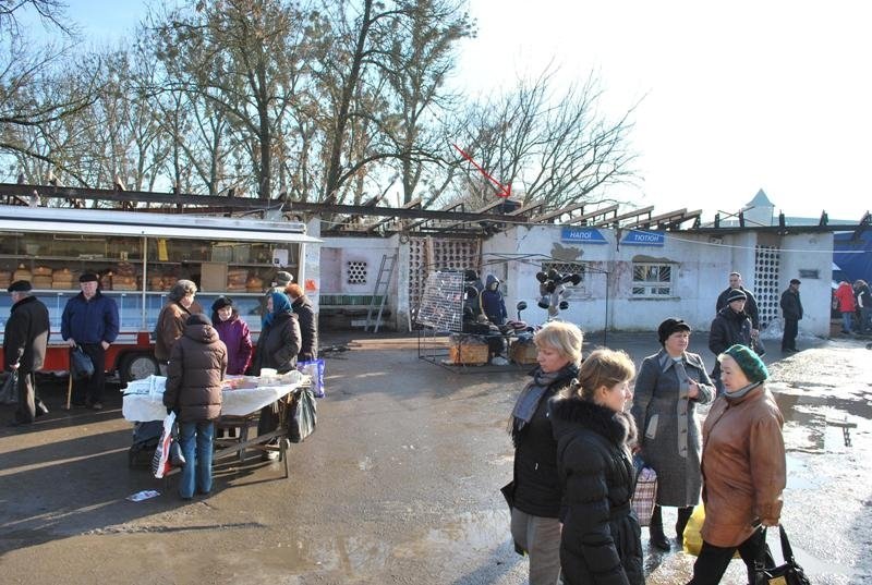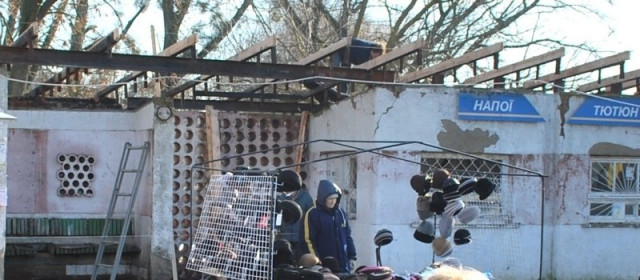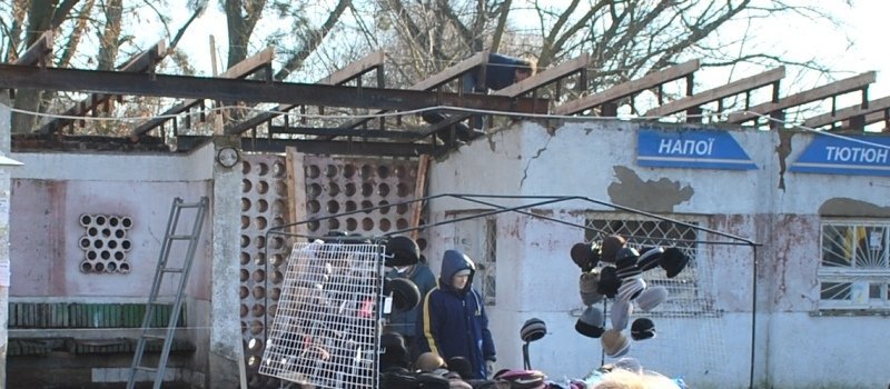 Нарешті зупинку біля Центрального ринку почали ремонтувати. На фото чоловік кладе нові дерев"яні балки на дах зупинки.