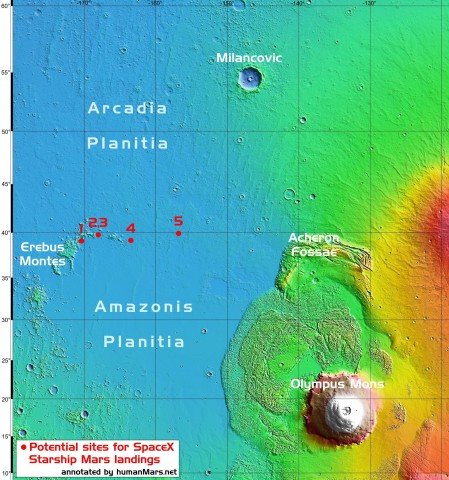 Де може приземлитися корабль SpaceX Starship? У базі даних камери Mars Reconnaissance Orbiter HiRise є ціла низка зображень, позначених як “місце посадки для кандидатів експедиції SpaceX”. Однією з головних вимог компанії до ландшафту – рівнинна місцевість і відсутність каменів.