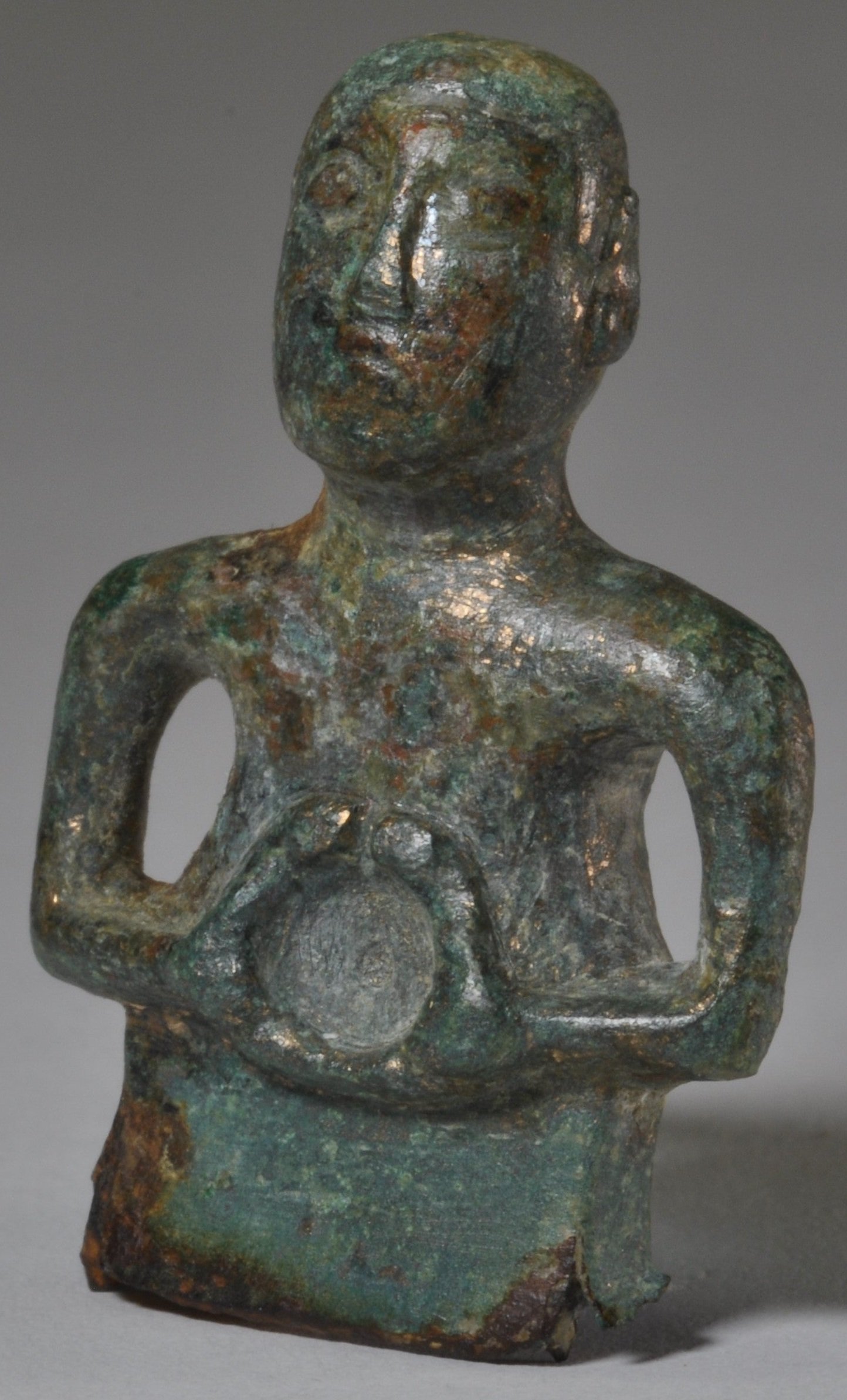Ймовірно, у фігурки була і якась декоративна вставка, втрачена з часом. На це натякають руки, складені на животі, що утворюють кільце.
