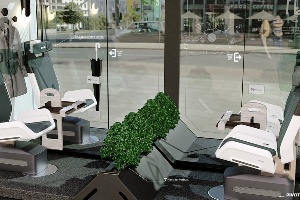 При цьому Pivot - все ж звичайний ефективний транспортний засіб. Поза капсул, між колесами, є багажне відділення для великих предметів, а в капсулах - тримачі для парасольок і місця для сумок і ручної поклажі. Після того як пасажир або група пасажирів завершили поїздку, капсула самодезинфікується за допомогою ультрафіолетового випромінювання. Про дезинфекцію інформують червоні світлодіодні вогні по кутах простору. Як тільки увімкнеться синє світло, можна заходити у Pivot.
