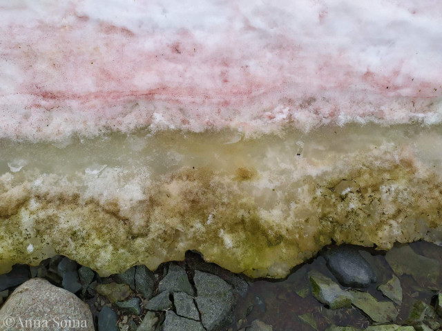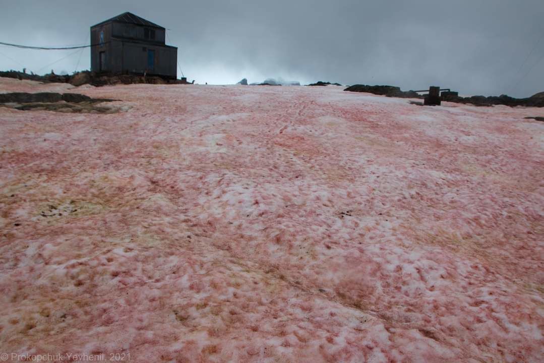 Цього року сніг замість білого став зеленим та малиновим. За словами вчених, таке забарвлення з’являється внаслідок розвитку мікроскопічних водоростей – рафідонем та хламідомонад сніжних.