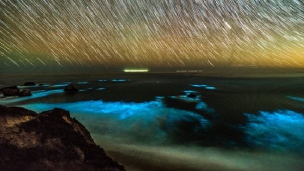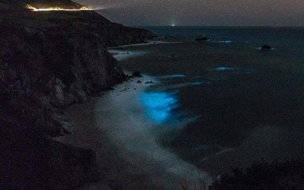 Біля берегів Каліфорнії у Сполучених Штатах Америки на мілинах яскравим блакитним світлом в темряві засвітилися води Тихого океану.
