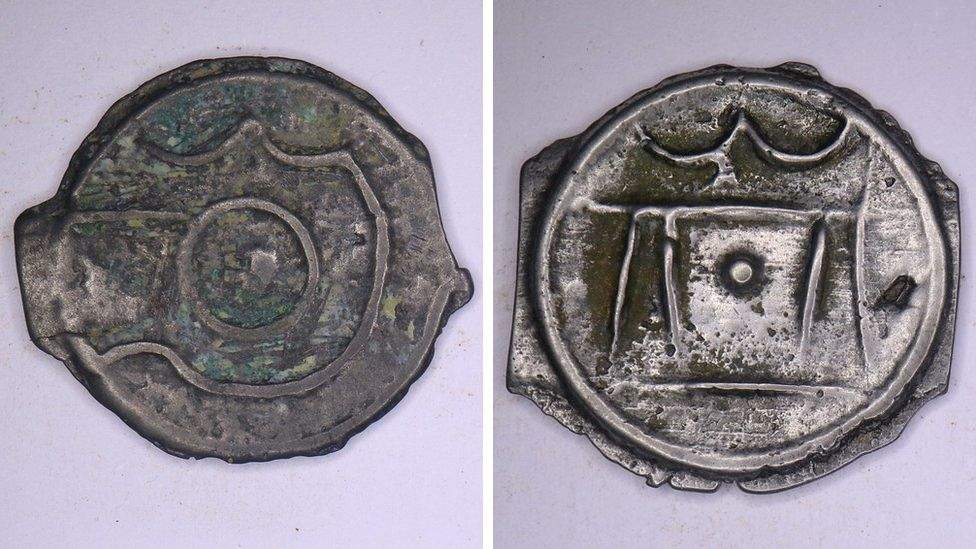 Монети, відомі як потини, зроблені зі сплаву міді, олова та свинцю. Кожна має діаметр в середньому 3 сантиметри і створені за зразком монет, відбитих у французькому Марселі приблизно 2175 років тому.