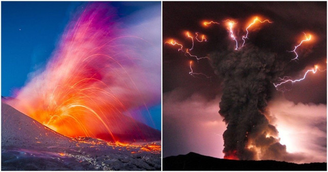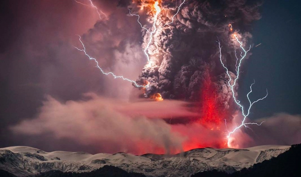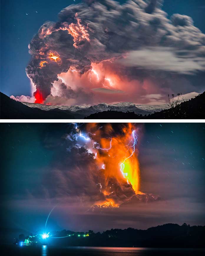 Величезні стовпи диму і попелу застеляють горизонт і здається, що вже нічого не врятує навколо в цей момент. Він зміг сфотографувати потужні удари блискавок, які немов електричні нитки зшивають небо з горизонтом.