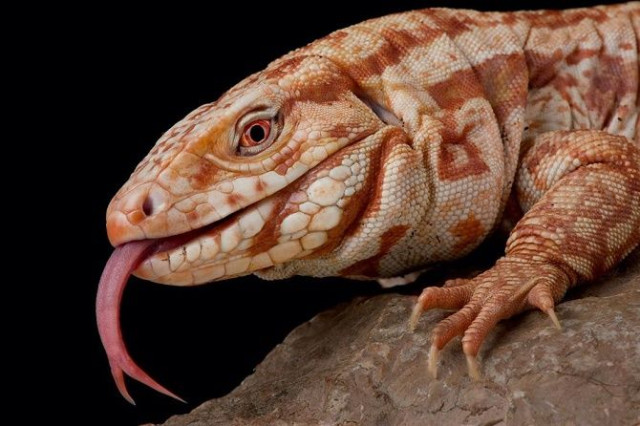 Червоний тегу – гігантський вид ящірок з важкою будовою, зустрічається в трикутнику Аргентини, Болівії і Парагваю. На фото представлений рідкісний варіант альбіноса, дивовижний зразок.