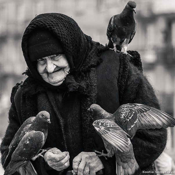 Я бачу цю бабусю майже кожен день. Це і є той приклад людяності, доброти, на котрому слід навчати дітей. Коли в нас вирувала навкруги агресія: революції, молодики з палицями в руках і балаклавами на обличчях, коли відчувався вже подих війни, голуби зліталися в певний час на площу і чекали цю стареньку жіночку. І вона приходить, годує птахів і собак, не дивлячись ні на що. Це є дієва доброта, це є та краса людської душі, ЯКА ВРЯТУЄ СВІТ!