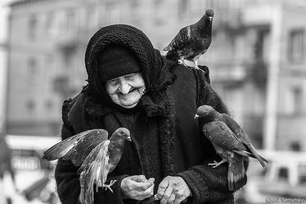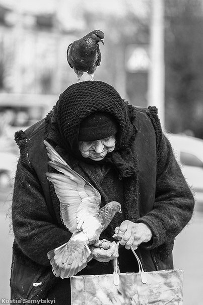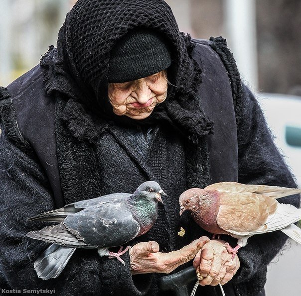 ця бабуся приходить вже не перший рік .і постійно їх підгодовує і в літку і взимку голуби зарання чекають на неї. знаючи що вона прийде .ми торгуємо поряд цілий рік я займаюсь морозивом і новорічною продукцією і нам все видно ми з нею бачимось постійно .цієї зими вона вийшла підгодовувати но птахів не було не злетілись ще. вона лишила пакет з зерном біля нас за палаткою і забула його ми забрали в палатку щоб не змок і тільки вона верталась до нас птахи масово злетілись до нашої палатки знаючи що воно лежить в нас .це дуже хороша людина. як пригощаємо морозивом то вона спочатку зовсім не хотіла в нас брати .і тільки тоді як ми з нею познайомились і розговорились вона взяла в нас. якщо даєш на паличці вона не бере тільки в стаканчику і біле без різних добавок. мотивуючи це тим що воно жирне і вона більшість постить або люди купують в нас то ми вже знаємо що давати МІЦНОГО ЇЙ НА МАЙБУТНЄ ЗДОРОВЯ !!!!!!!!!!!!!!!!!!!!!!!!!!!!!!!!!!ПОБІЛЬШЕ ТАКИХ ЛЮДЕЙ