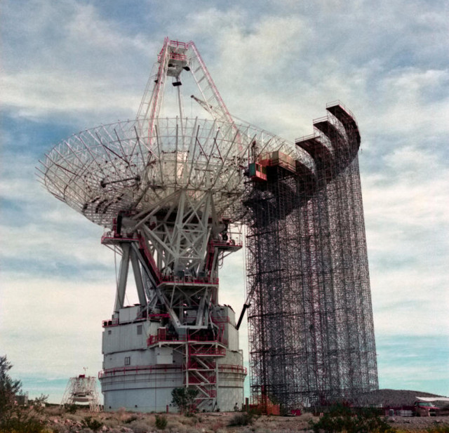 Врешті-решт, сигнал було отримано на радіоантені у м. Голдстоун, Каліфорнія, яка є частиною мережі Deep Space Network (DSN).Для того, щоб “поговорити” з віддаленим космічним апаратом “Вояджер”, NASA зробило стрибок у космічних технологіях зв’язку. На фото – антена, діаметром 64 метри в Голдстоуні, штат Каліфорнія, збільшена до 70 метрів.