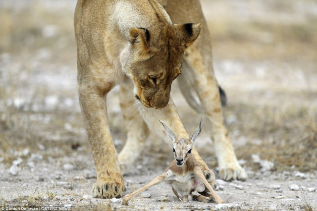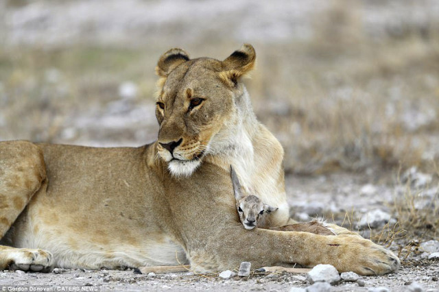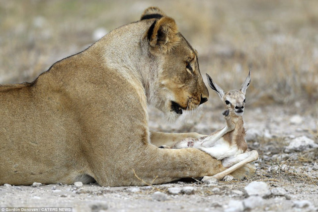 Нью-йоркський фотограф 53-річний Гордон Дован сфотографував у національному парку Etosha National Park левицю, котра усиновила дитинча антилопи.