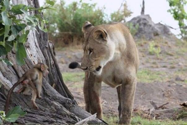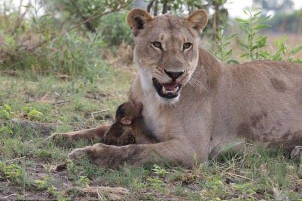 Фотографи були шоковані тим, що зробила левиця. Вона замість того, щоб накинутися на малюка, стала м'яко грати з ним лапою і підштовхувати до себе. Кілька хвилин – і маленький бабуїн зрозумів, що левиця не планує його їсти (принаймні поки що), і спокійно припав до хижачки.