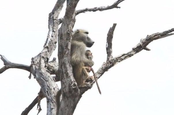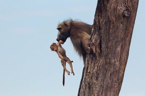 За цим випадком спостерігали не лише фотографи, але й самець бабуїна. Як тільки з'явився зручний момент, він схопив малюка й потягнув на дерево.