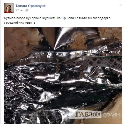 «Купила вчора цукерки в Фуршеті на Єршова. Гляньте, які господарі всередині них живуть», – йдеться у дописі.