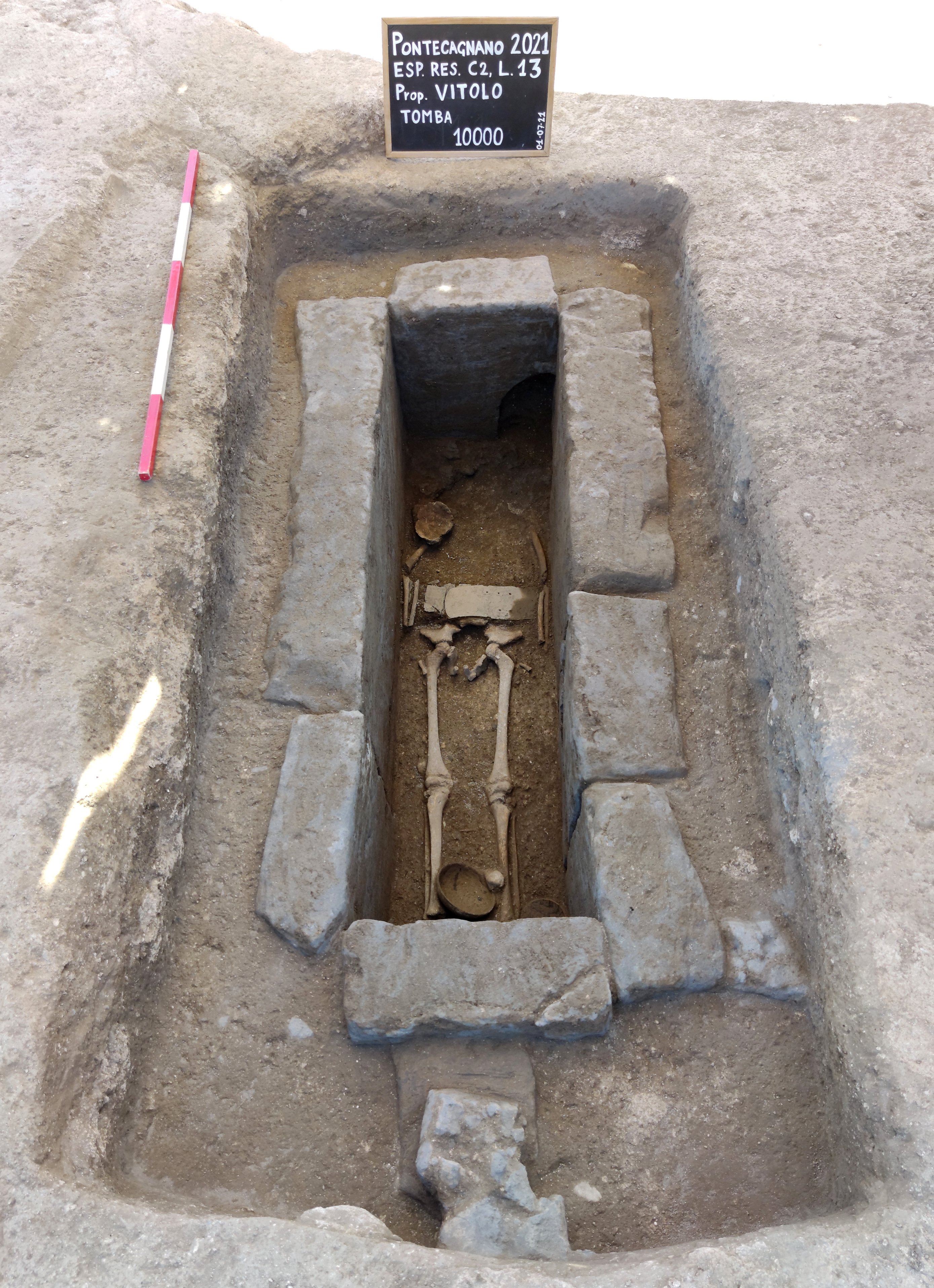Покриття гробниці, яке було знайдено на місці, зроблено з трьох шматків туфу. Камені, що утворюють коробку і кришку, точно змодельовані, сторони ідеально квадратні. Могила хлопчика – 10-тисячна, розкопана в некрополі Понтеканьяно.