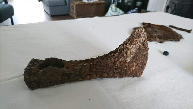 Спочатку Крістіансен подумав, що маленьким темним круглим предметом з отвором в середині є коліщатко від старої іграшки. Після глибшого копання чоловік знайшов сильно заіржавлену залізну сокиру та кілька інших кусків заліза. Згодом з’ясувалося, що «коліщатко від машинки» – намистинка з темно-синього скла.