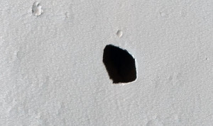Орбітальний апарат NASA Mars Reconnaissance Orbiter виявив за допомогою камери HiRise на поверхні Марса загадковий глибокий отвір (на фото він виглядає як чорна пляма) діаметром 180 метрів.